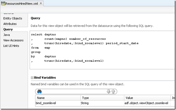 You will notice how this query does the aggregation at a time zoom level that is determined through the bind parameter bind_zoomlevel. This bind parameter is then defined to take its value from the Groovy expression adf.object.viewObject.zoomLevel. This refers to a getter method called getZoomLevel() defined in the ViewObjectImpl class created for the ResourcesHiredView ViewObject.