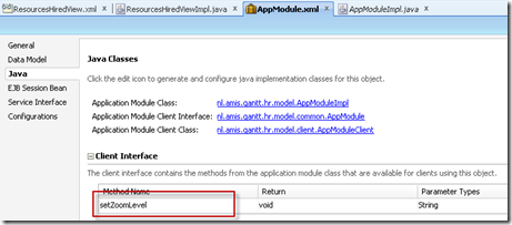 Note that whenever the handleZoomLevelChange method is called, the new value set for the zoom level is passed to the setZoomLevel method on the Application Module and thereby exposed as the underlying value for the bind parameter used in the query in ViewObject ResourcesHiredView. After that, the Gantt Chart gets refreshed – through the partial target refresh.