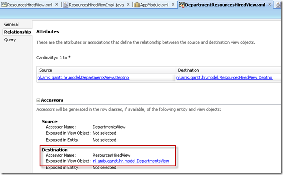 The last thing we need to do in the Model is to create a ViewLink from DepartmentsView to ResourcesHiredView and expose an accessor for that ViewLink in the DepartmentsView.