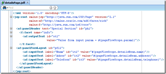 The taskflow consists of a single page fragment – detailsPage.jsff. It shows three values taken from the pageFlowScope bean detailsBean. It also shows the value of the input parameter that is passed into the taskflow.