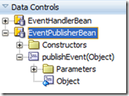 This class – EventPublisherBean – is exposed as a Data Control, through the same action as was applied to the EventHandlerBean.