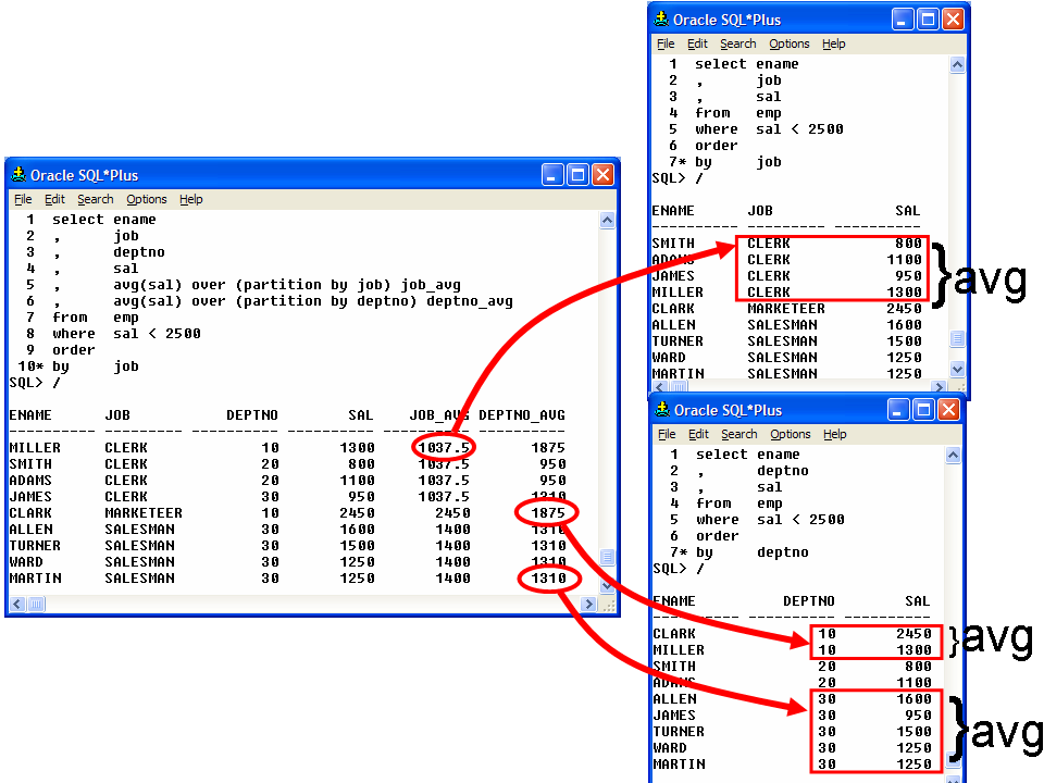 select ename , job , sal , deptno , avg(sal) over (partition by job) job_avg , avg(sal) over (partition by deptno) deptno_avg , avg(sal) over () total_avg from emp where sal < 2500 order by job
