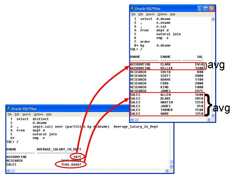 We can see that the average salary for ACCOUNTING is arrived at by taking the partition that consists of all Employees in department ACCOUNTING and then calculating the average of all their salaries.