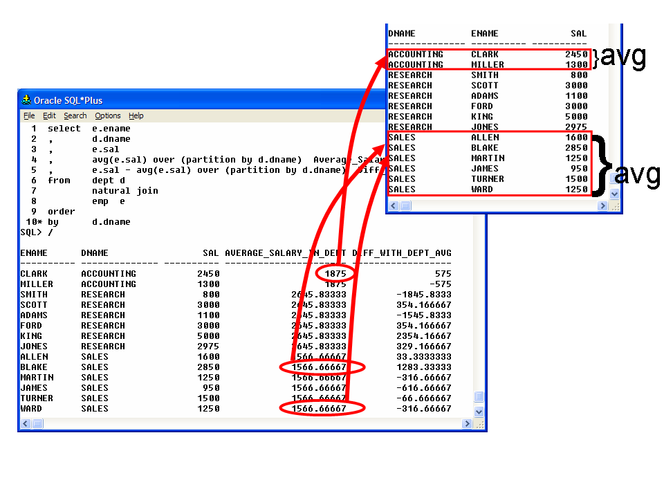ENAME JOB SAL DEPTNO JOB_AVG DEPTNO_AVG TOTAL_AVG ---------- --------- ---------- ---------- ---------- ---------- ---------- MILLER CLERK 1300 10 1037.5 1875 1355.55556 SMITH CLERK 800 20 1037.5 950 1355.55556 ADAMS CLERK 1100 20 1037.5 950 1355.55556 JAMES CLERK 950 30 1037.5 1310 1355.55556 CLARK MARKETEER 2450 10 2450 1875 1355.55556 ALLEN SALESMAN 1600 30 1400 1310 1355.55556 TURNER SALESMAN 1500 30 1400 1310 1355.55556 WARD SALESMAN 1250 30 1400 1310 1355.55556 MARTIN SALESMAN 1250 30 1400 1310 1355.55556