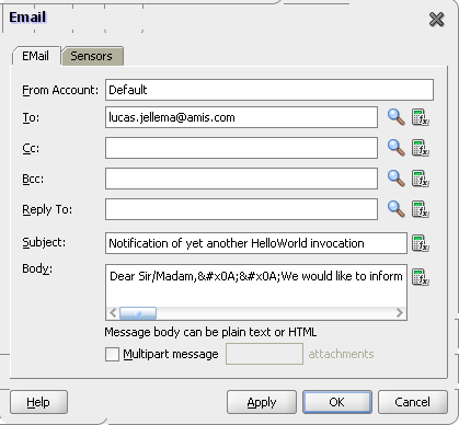 The configuration of the email activity must be specified. This includes the subject and body of the message (both can contain dynamic values from BPEL process instance) as well as the addressee (again, can be derived dynamically as well as defined at design time):
