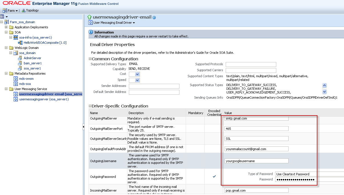At this point, the SOA Server needs to be restarted to have the changes take effect.
