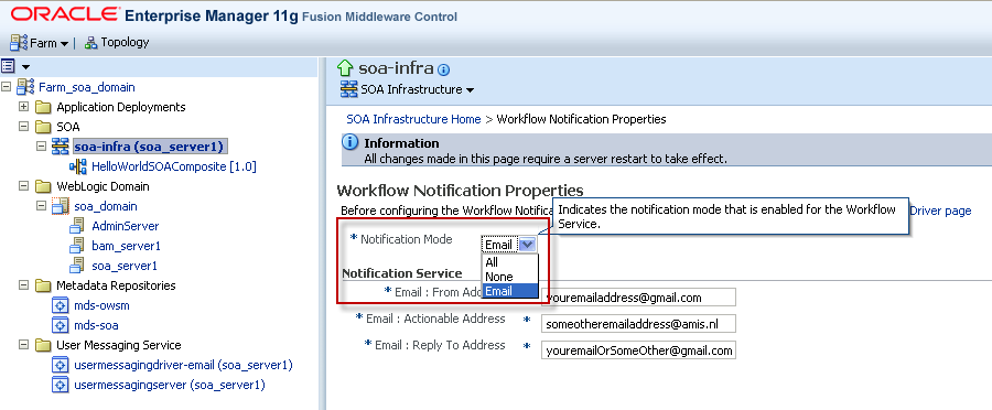 The Workflow Notification Properties are shown. Only one is really important at this point: the Notification Mode (default value is None) must be set to either All or Email, otherwise any notification is not really sent onwards by the SOA Suite to UMS!