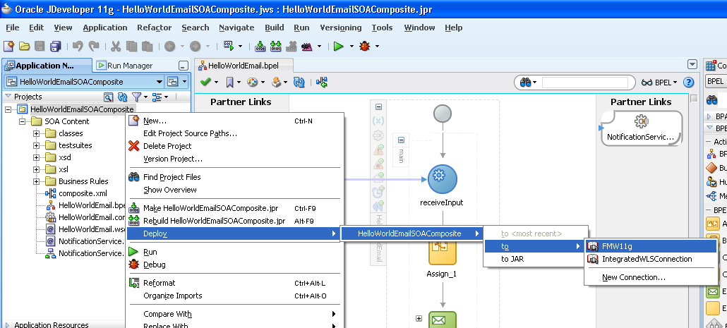 You will be prompted to provide a name for the application – for example HelloWorldEmailSOAComposite – and a name for the project – the same or any other name will do nicely. JDeveloper then asks you what type of composite application this will be; pick ‘Composite with BPEL’ on the Configure SOA settings step. Press Finish to have the application, project and service composite created.