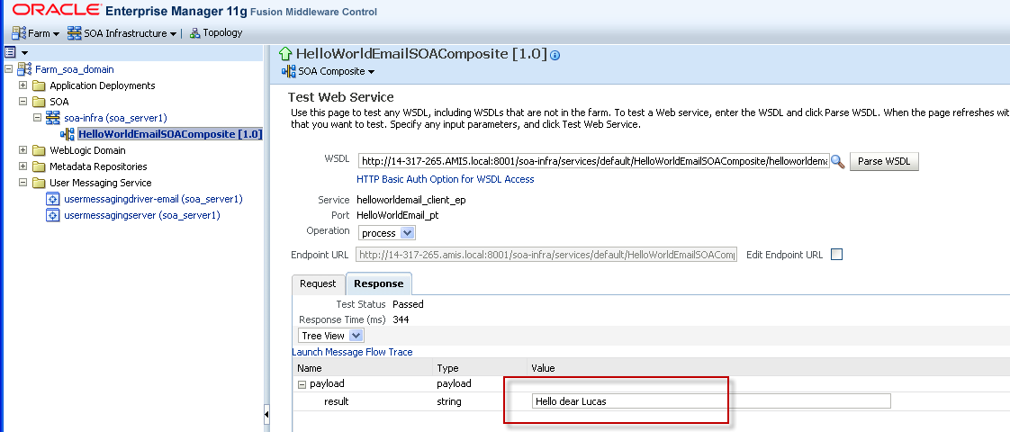 Open the Enterprise Manager (http://host:7001/em). Expand the node SOA node under the root node Farm_soa_domain. The node for HelloWorldEmailSOAComposite application should be listed. Select the node. The right side of the page is refreshed to present the details for this composite application. Click on the Test button to call the service exposed by this composite application. Enter a value for the input field – for example your first name – and press the button labeled Test WebService. The web service is invoked. This will create a new instance of the composite application. After a few seconds, the result from the service should be displayed, something to the effect of ‘Hello dear Lucas’.