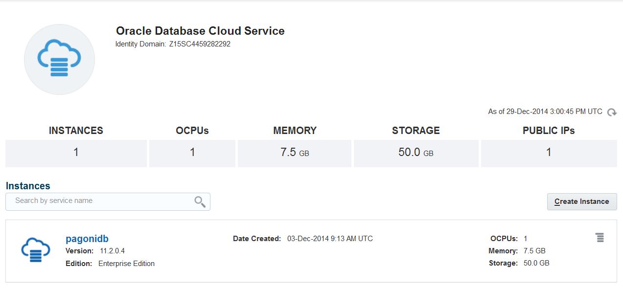 As you can see there are separate pages for each kind of service. When you click on the Database Cloud Service you’ll be taken to the next page, showing you which databases you already have and giving you the opportunity to create a new one.