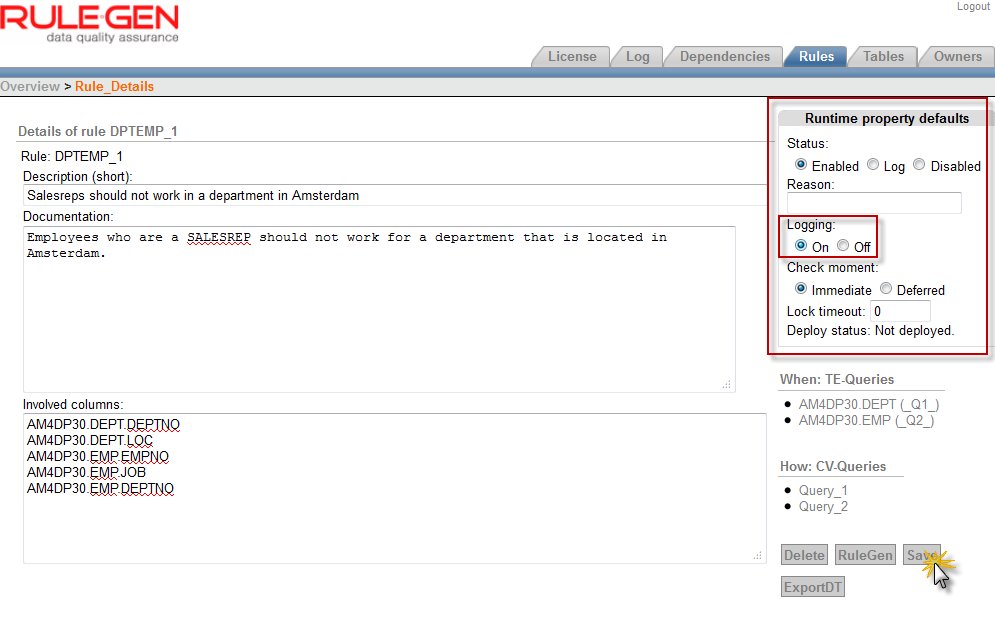 Rules have several attributes that determine how RuleGen deals with them at run time. These attributes include the validation time: should this rule be enforced at statement level or (deferred) at transaction level. Another attribute is the status of the rule: enabled or disabled or log only. The latter status means that rules will be validated but not enforced; any rule violation is logged. And whether or not violations are written to the log history is governed by the Logging attribute.