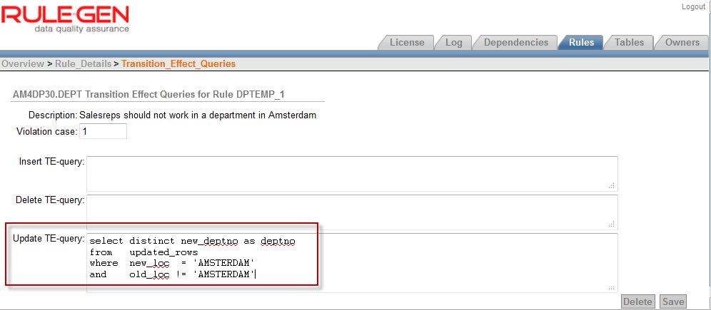 The Transition Effect Queries page appears. On it, we can enter three queries – one for each DML operation (Insert, Update, Delete). The result of this query is fed into the validation query as a means to select the rows to perform validation on. Only an update operation on DEPT should trigger validation of the rule – as was found in our earlier analysis. That analysis also showed that not just any update triggers validation, only an update of column LOC should have that effect. And only if the value of LOC after the update is AMSTERDAM, should the update of DEPT trigger validation of the rule. The TE query returns the values of DEPTNO for all department records for which that filter condition holds true: updated in the statement, with a changed LOC value and with AMSTERDAM as LOC value after the update.