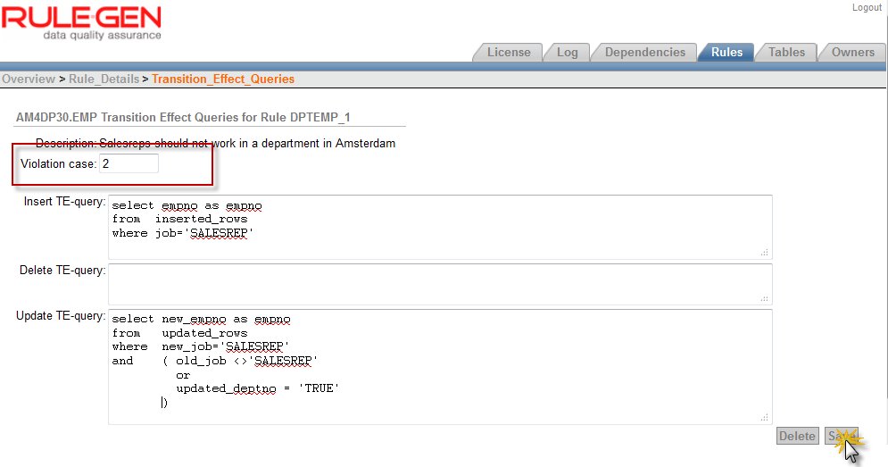 The TE Queries for EMP will in this case return the empno values for those employees that require validation as a result of the transaction against EMP. That means that we also need a second CV-Query – the first one has deptno values for its input and will report on a problematic department while the EMP related TE queries will report on employees who have the wrong job or the wrong department. That means in RuleGen terms that we are dealing with different violation case. We specify this by setting the value of Violation case to a different value than its default of 1. Note: it is also possible to have the EMP TE-queries return the distinct deptno for the departments that contain the employees that require validation. In that case, we could use the same CV Query for both angles – department and employee – and work with the same value for Violation case.
