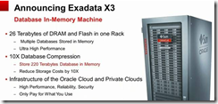 The Exadata X3 Database In Memory Machine uses 26 Terabytes of memory (that is 26 Tb !- split among 4TB of DRAM and 22TB of flash cache, in one rack – four times the FlashCache size of the previous version of Exadata) that allows you to store entire databases in memory. Everything in the SGA.