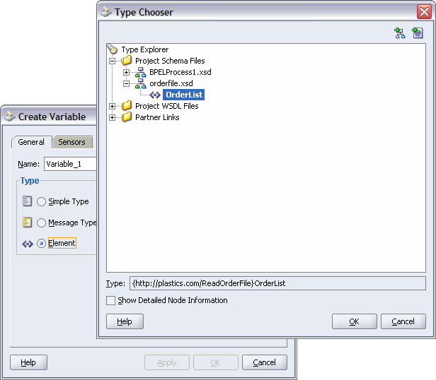 Still, not a single sign of trouble, the Schema is present, it folds open to show the elements that it defines, you can select one and press OK, and still everything is fine. Only when you press the final OK in the “Create Variable” dialog will you hit an error: