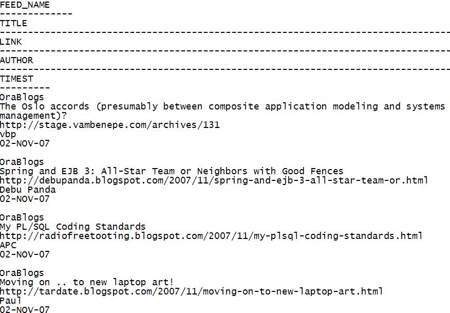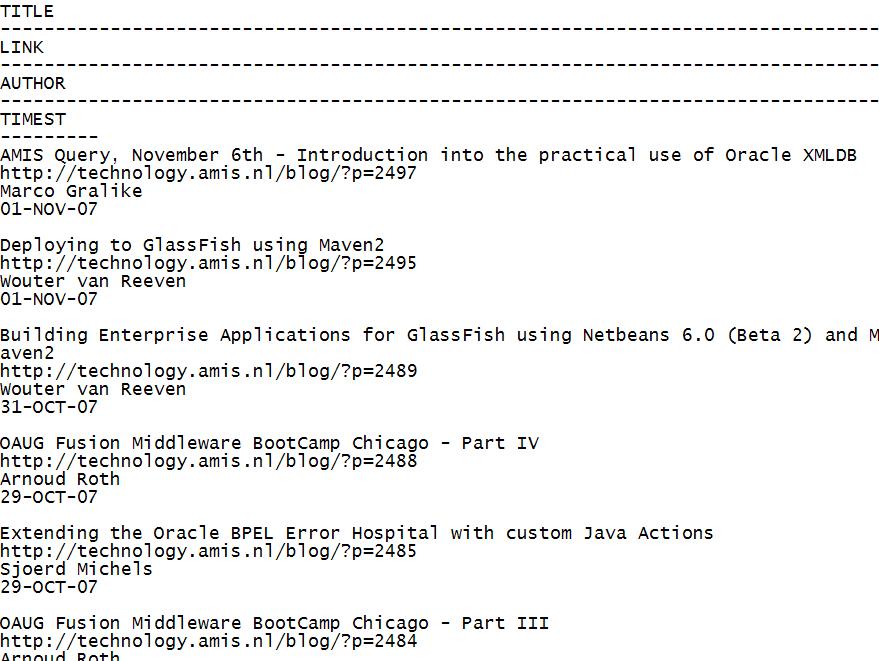 There are times when a challenge presents itself. Often for no logical reason and without any direct benefit. Like doing a crosswords. I have this unconscious part of me that keeps sending me inane challenges, that I cannot seem to shake myself free of. Yesterday morning – very early morning I might add – I felt this urge to write a SQL query that can directly query RSS feeds pulled from the internet into the database with UTL_HTTP. So at 5.30AM, I was sitting at the kitchen table with my laptop, facing this challenge. And it turned out to be fairly simple and rather elegant. So I will share it with you.