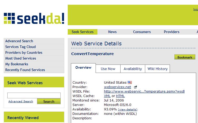 I frequently have a problem to find a publicly available web service for any demo or article. Today, I came across a web site called http://seekda.com/. This site offers pointers to many different web services, including the one I needed: Convert Temperature (from Celsius to Fahrenheit and back). Its description is at: http://seekda.com/service_details?uri=http%3A%2F%2Fwww.webservicex.net%2FConvertTemperature.asmx%3Fwsdl .
