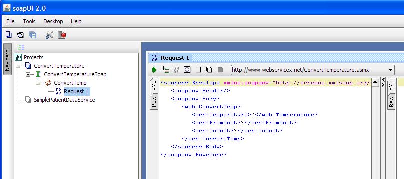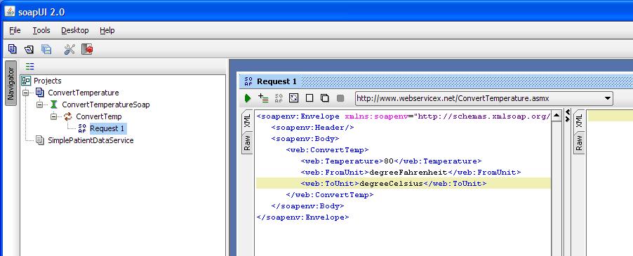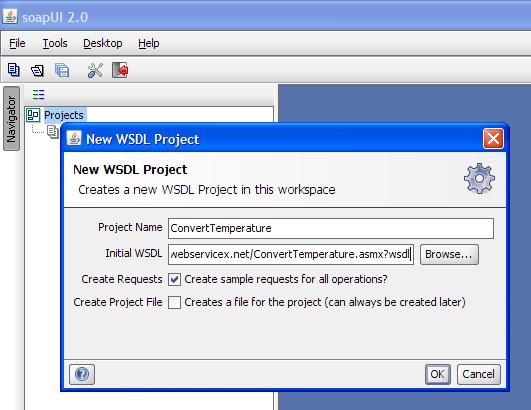 I downloaded soapUI, an open source Web Service Testing tool. It can do quite a bit more than just testing by the way – or it has a pretty broad definition of the term testing. Anyway, after downloading soapUI, I ran it. I create a new WSDL project and feed it the URL of the WSDL for the ConvertTemperature Service: