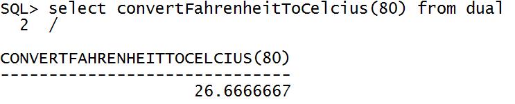 With the new function in place, we can write queries like this one – and get the temperature converted. Mind you – the performance of this particular function is not wildly terrific; we could certainly benefit from the 11g Result Cache feature for this one. Or of course learn how to do this calculation ourselves.