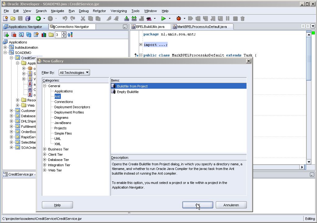 The Quick Start guide for the SOA Order Booking application assumes that all components are installed from JDeveloper. In order to automate builds, we need build scripts. For Oracle BPEL projects these Ant build scripts are created automatically by JDeveloper. The demo application does not come with build scripts for the Web Services neither for the ESB components. In this paragraph I outline the creation of an Ant build script for the CreditService.