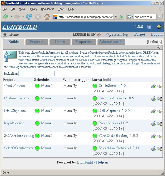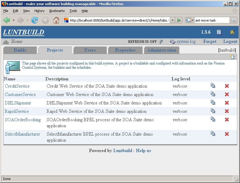 Now that the entire toolkit is installed and the Ant build scripts are created, it is time to configure Luntbuild. I simply created Luntbuild projects for each component in the SOA demo application.