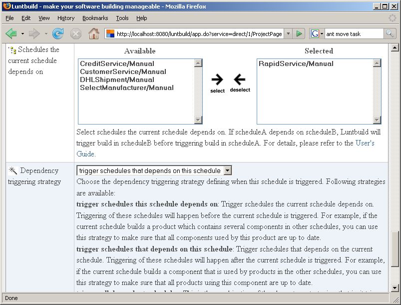 For setting up dependencies between projects Luntbuild provides multiple strategies. I set up dependencies between the projects preserving the order that is outlined in the SOA demo application quick start guide and have each project trigger the next in order.