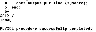 > declare procedure put_line(d date) is begin sys.dbms_output.put_line(‘Today’); end; begin dbms_output.put_line(sysdate); end;