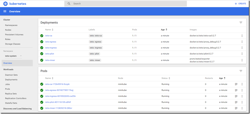 On the dashboard, when I switch to the istio-system Namespace, I can see more details