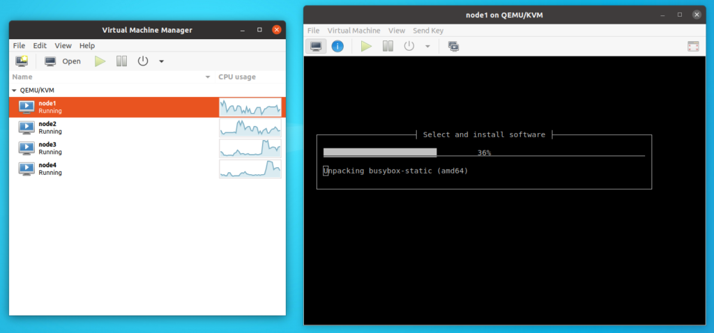 You can monitor progress by opening the virt-manager and specific machines. After the script is complete, the machines will be shutdown.