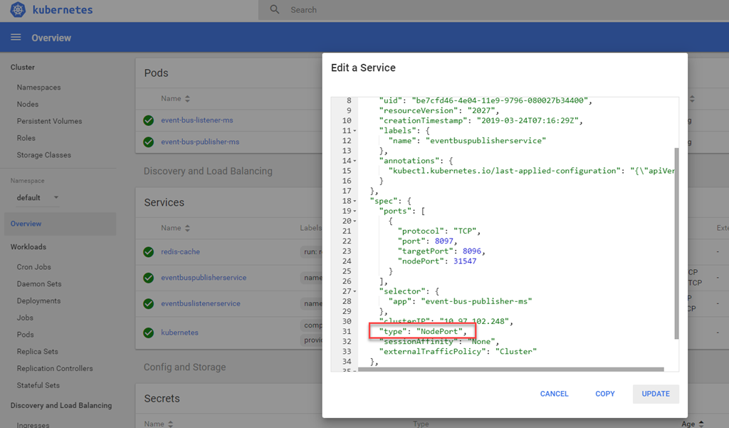 Check in Kubernetes Dashboard or through kubernetes get pods and kubernetes get services if the creation is complete – and what the port is that was assigned to the EventBusPublisherService.