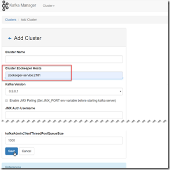 zookeeper-service:2181 and press Save. Note: this is not the creation of new Kafka cluster but instead the registration with Kafka Manager of an existing cluster.