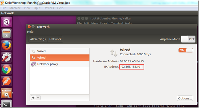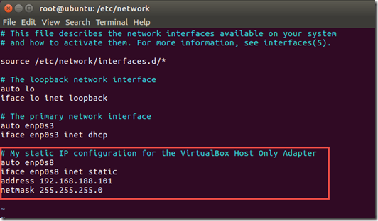 Open a terminal window. Switch to super user mode: sudo su. Using ifconfig verify the state of the network interfaces and determine the name of the network interface associated with the Network Adapter configured in Virtual Box for the Host-Only Adapter. In my case, this would be the second network interface in the Ubuntu VM.