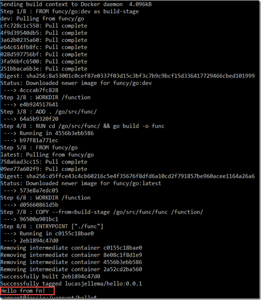- Deploy the new function (in its own Docker Container running inside the container running Fn server)