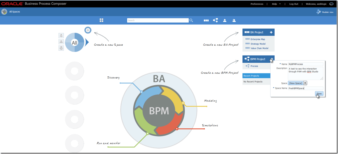 On the home page, there are several areas that you can step into: business architecture and BPM processes are the main ones. To create a new BPM project, click on the plus icon in the BPM Project title area. Provide the name and description of the project and select an existing or new space.
