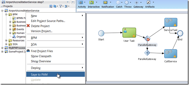 After making changes to the process definition and the other project assets, these changes can be published to PAM – for further inspection and manipulation by other developers in JDeveloper or in Process Composer: