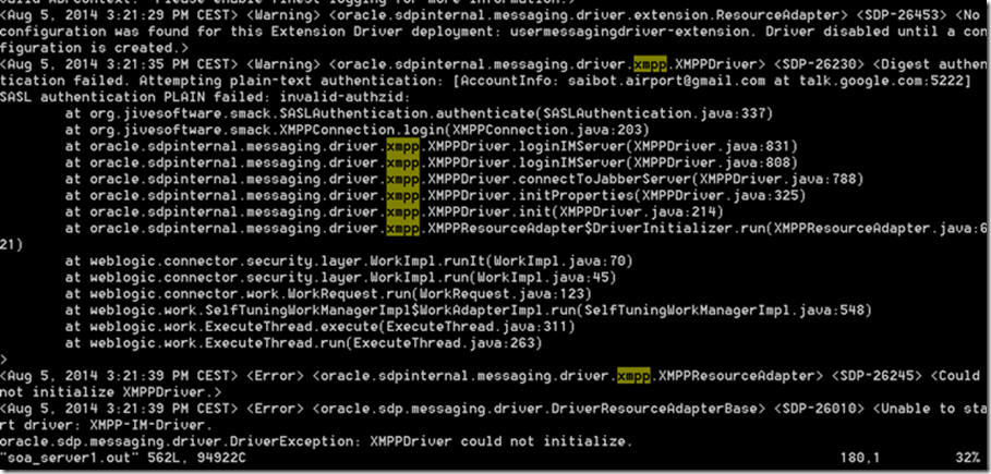 <Aug 5, 2014 3:41:57 PM CEST> <Warning> <oracle.sdpinternal.messaging.driver.xmpp.XMPPResourceAdapter> <SDP-26200> <An exception was caught. oracle.sdp.messaging.driver.DriverException: XMPPDriver could not initialize.