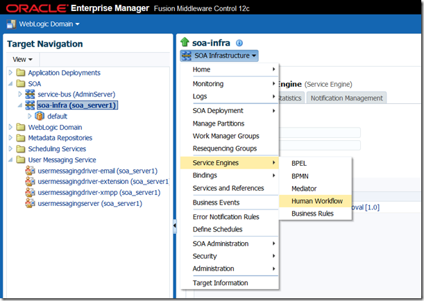 Select the node SOA | soa-infra. Open the dropdown menu and select Service Engines | Human Workflow.