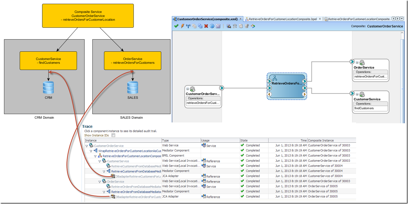 A BPEL process is instantiated. It invokes the CustomerService – that in turn makes a single call to a database adapter service (for the query against CUSTOMERS). Next the BPEL process goes on to invoke the OrderService (just a single invocation). This composite too invokes a database adapter service (for the query against the ORDERS table). This is also a single call – a single round trip from SOA Suite run time to the database.