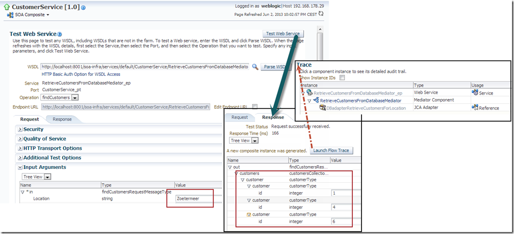 The CustomerService is implemented using a SOA Suite Composite Application; note: we could just as well have used the Service Bus in this case.