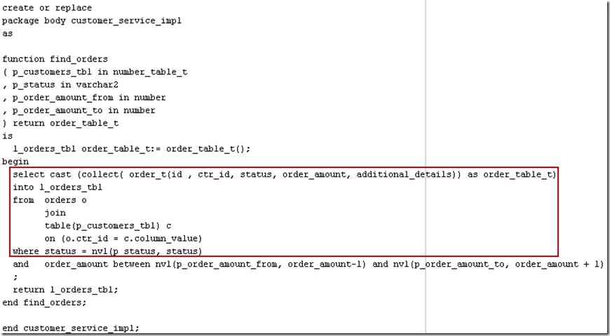 The function find_orders is invoked with a number_table_t – defined as CREATE TYPE NUMBER_TABLE_T AS TABLE OF NUMBER – that contains the identifiers of the customers whose orders should be retrieved. Other search criteria are the status of the orders and an upper and lower boundary for the order amount. The function returns an instance of order_table_t – which means it returns a collection of order_t objects.