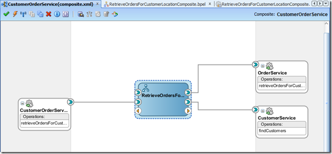 WebService References are created in the composite for each of the two domain level services that need to be invoked. A BPEL component is added and wired to these two references. The CustomerOrderService is exposed as service and wired to the BPEL component. In go a location and out comes a list of orders: