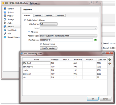 Secondly you have to do port forwarding in virtualbox. As you can see port 22 is mapped to 2222. This is because you are not allowed to map to ports below 1024.