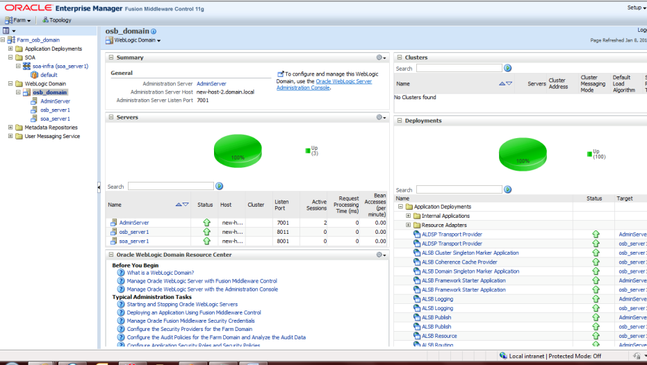 The OSB is installed and configured now. If you reboot the adminserver and nodemanager are automatically started. I usually start managed servers manually the first time and enter the credentials when asked for. You can start the managed server from the administation console from now on. Make sure you have set the communication to plain (Environment –> Machines –> soa_machine –> configuration –> Node Manager)