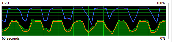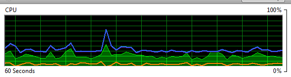 CPU Utilization with default settings (Orange line is virtualbox process in windows)