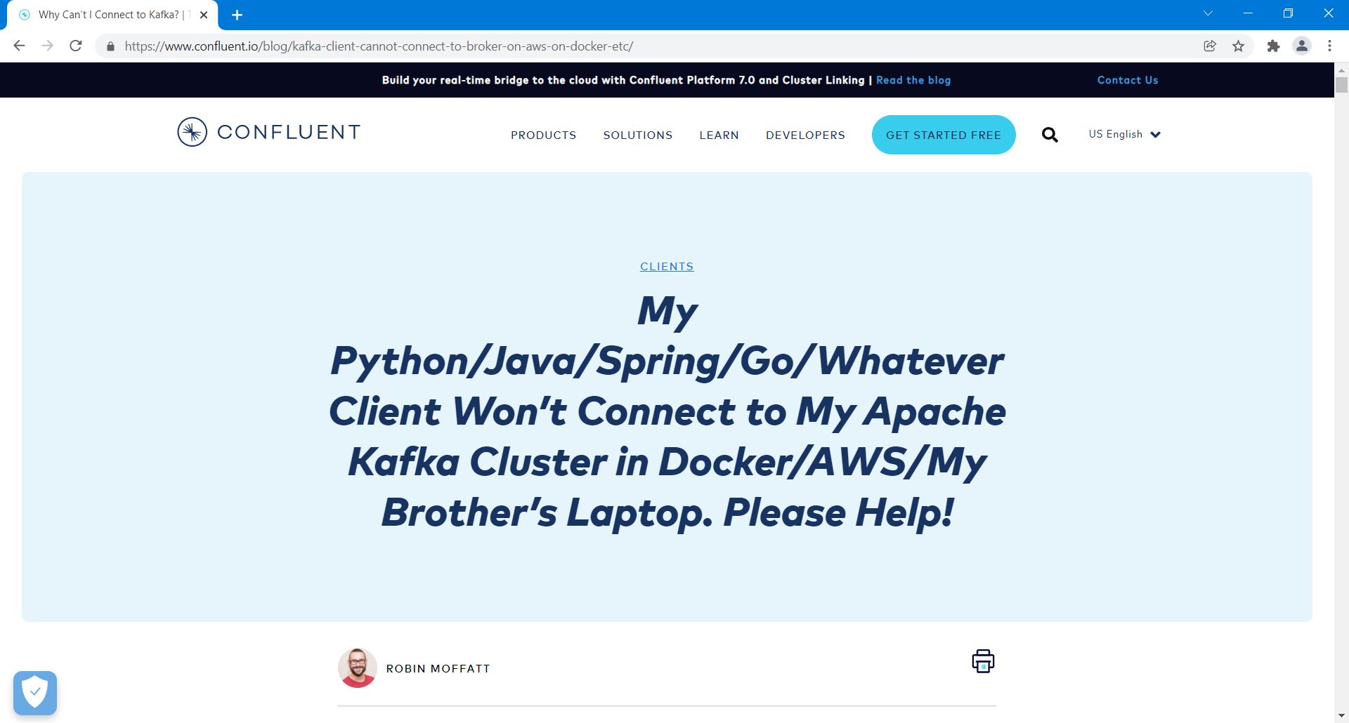 The article describes connecting a client to Kafka in various permutations of deployment topology.