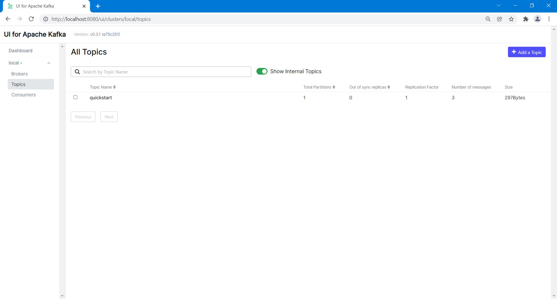On the other hand, when I tried another Web GUI for Apache Kafka named “Kafdrop” (http://localhost:9000), where the container was created via a docker-compose.yaml file that bundles a Kafka/ZooKeeper instance with Kafdrop, everything worked as expected.