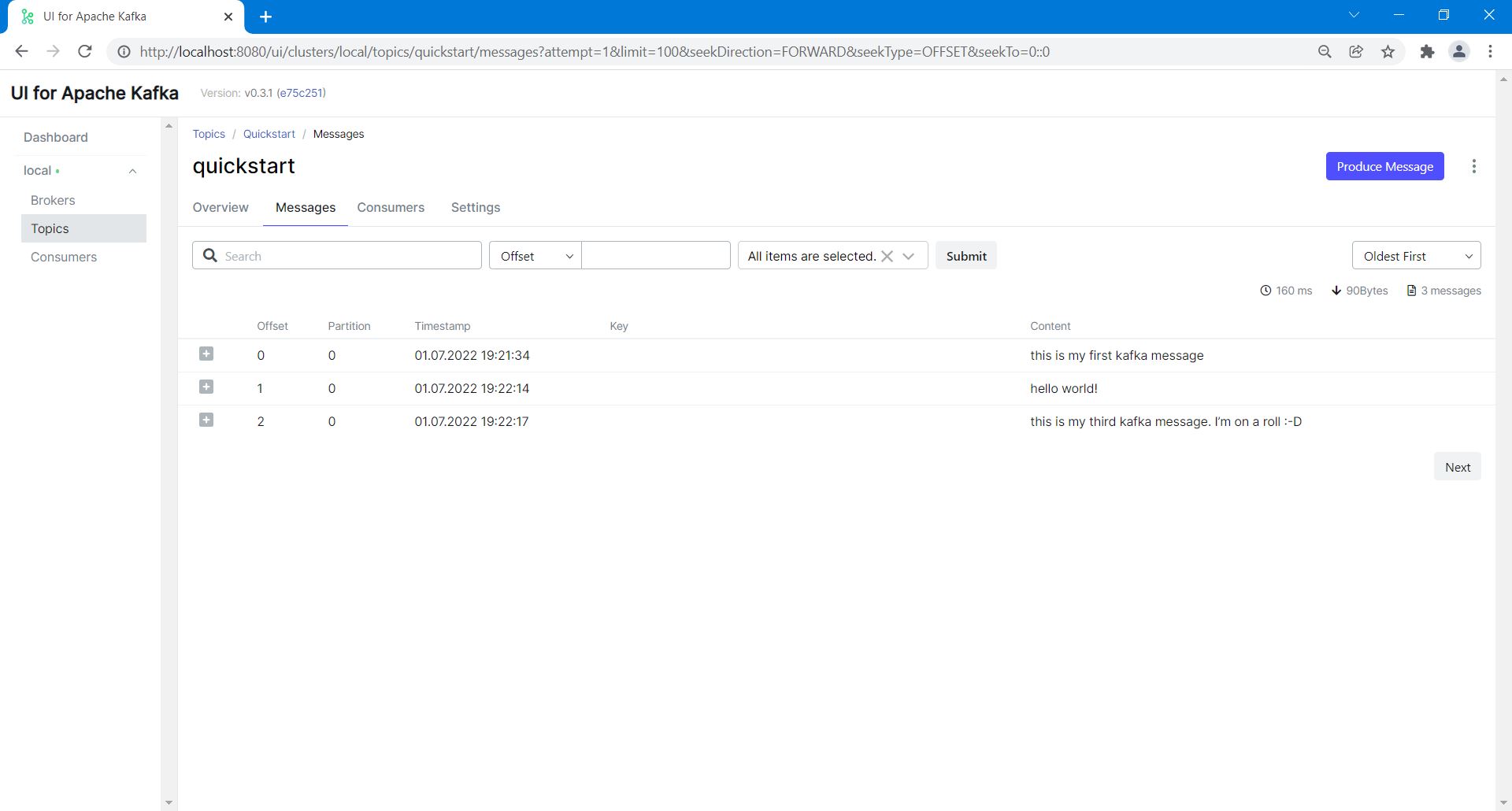 Now, I wanted to create a topic and write messages to the topic, just to see if these were picked up by the web UI. So, I repeated some of the steps from the Quick Start.