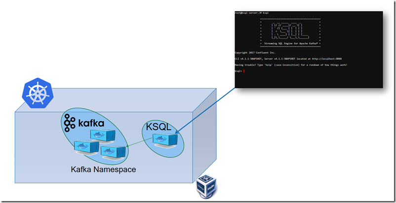 What I am looking for is a way to run KSQL on my Kubernetes cluster, and preferably not the full platform. And more importantly: I want that KSQL instance to interact with my own Kafka Cluster, that is also running on that same Kubernetes instance. In a previous article – 15 Minutes to get a Kafka Cluster running on Kubernetes – and start producing and consuming from a Node application – I described how to get going with Apache Kafka on Kubernetes. The final situation in that article is my starting point in this piece.