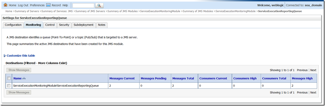 - Invoke the SOA Composite and check the JMS Queue monitoring page in the WebLogic Administration Console (to find messages produced for web service calls)