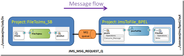 The use case covers the usage of the JMS adapter by both SB and BPEL, for both receiving and sending messages. The following 2 situations are covered:
